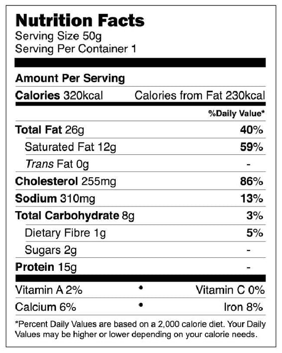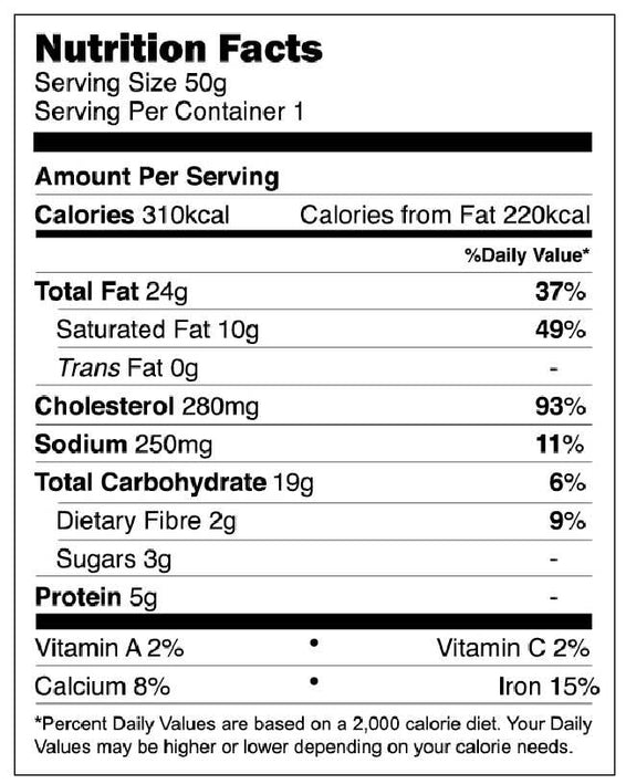 Fish skin, vegetable oil, salted egg, milk, sugar, margarine (vegetable oil, salt, soy lecithin, vitamins, antioxidants BHT and BHA, permitted colouring, permitted flavouring), chili powder [sugar, salt, chili, pepper, flavour enhancer (E621, E635), paprika oleoresin, maltodextrin, palm fat, egg, wheat, lactose, canola seed, soy sauce (soybean, wheat, salt), spices], curry leaves, garlic.